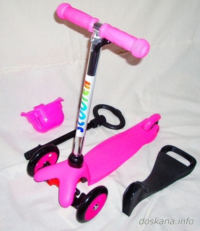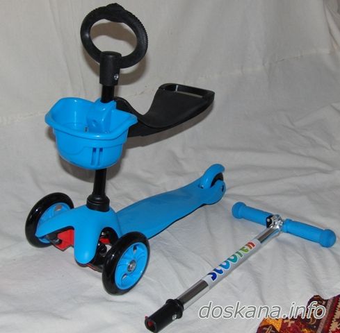 Самокат трёхколёсный 3 в 1 с сиденьем новый Scooter- оригинальный самокат для самых маленьких трансформирующийся из каталки в обычный самокат. Для этого в комплекте есть два съёмных руля - О-образный с сиденьем и корзинкой и Т-образный. Управляется самокат путём наклона руля