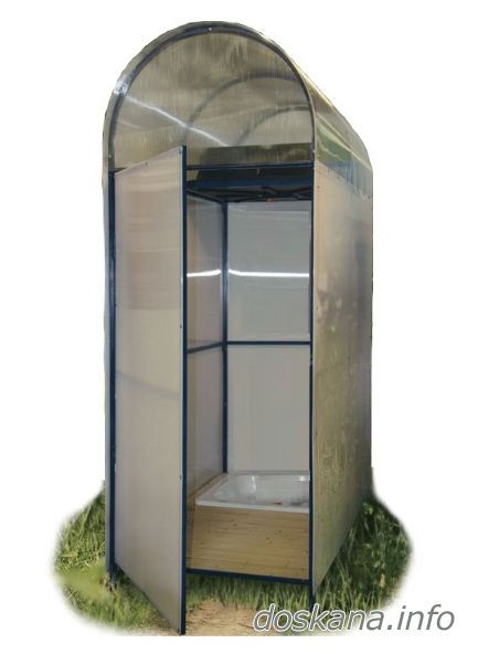 Инновационное решение этого дачного душа – закрытая кабина, выполненная из белого поликарбоната и арочная крыша изпрозрачного, что позволяет удерживать тепло как в теплице.